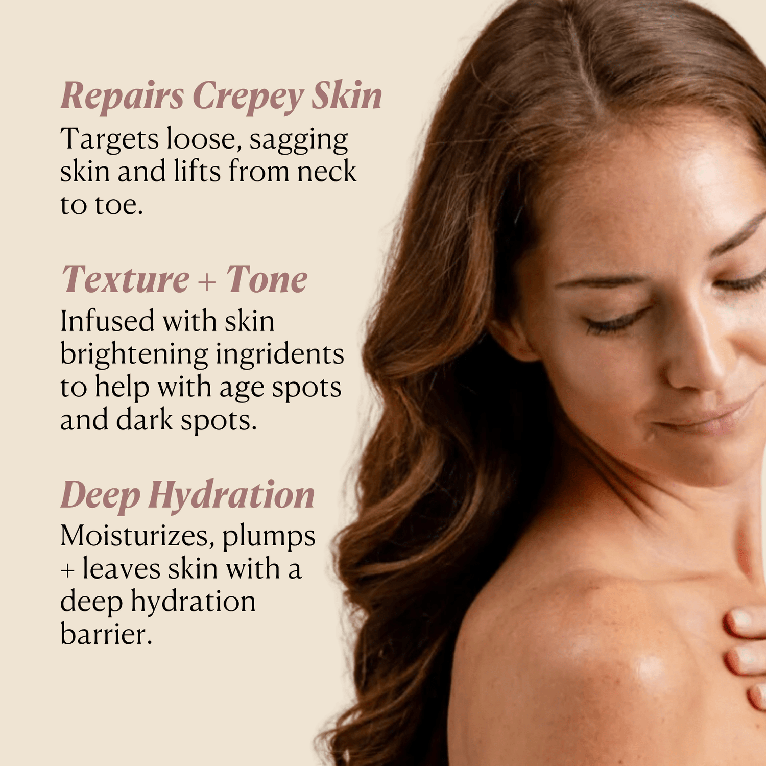 Repair + smooth skin from neck to toe to improve crepey skin, skin tone, fine lines & wrinkles on the body.