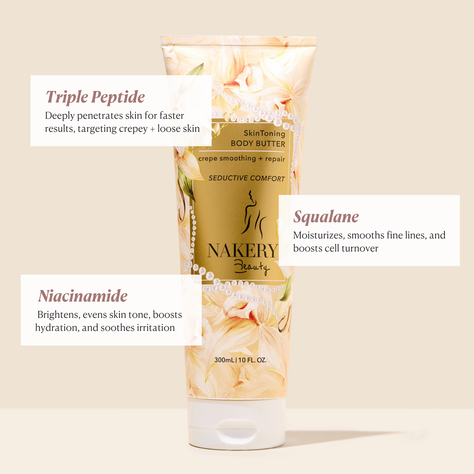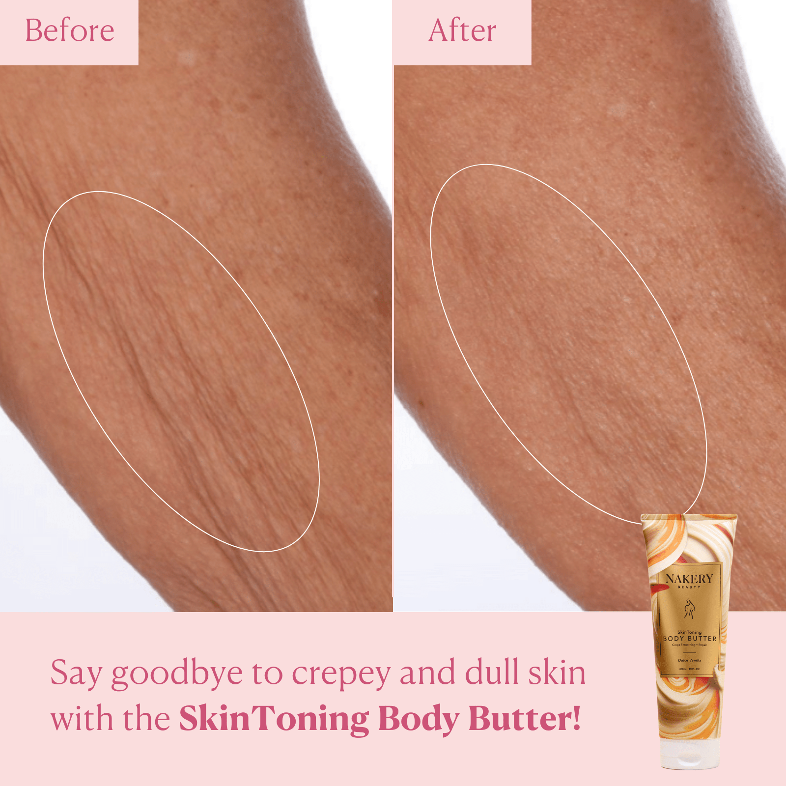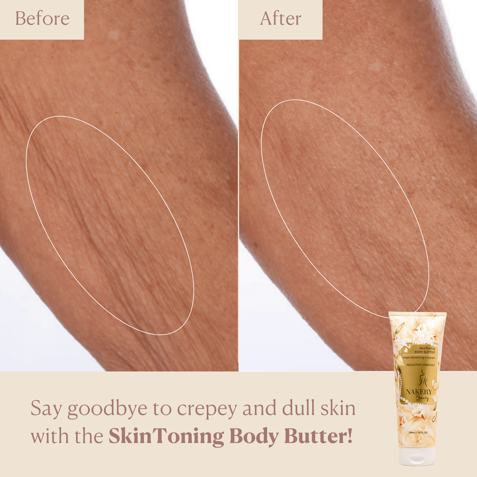 This body butter is designed to repair crepey skin, target loose and sagging skin, and provide overall toning and hydration for the body.